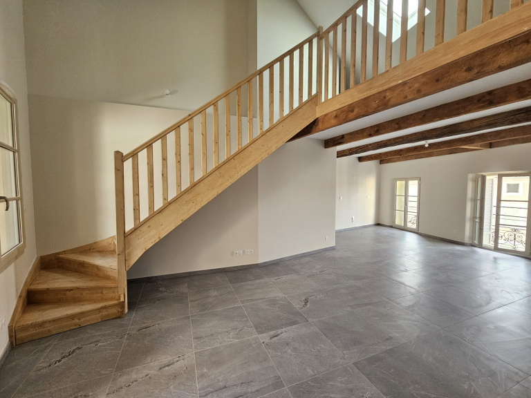 Appartement de type 4 spacieux et lumineux composé au premier niveau d'une entrée, un wc, une salle d'eau, deux chambres, un grand séjour donnant accès sur la terrasse, avec cuisine neuve équipée.